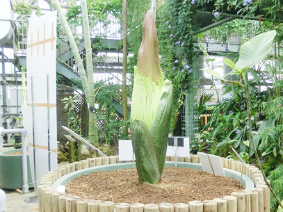 インドネシア・スマトラ島の限られた場所に生える、サトイモ科の絶滅危惧植物。世界最大級といわれる「花」(1つの花のように見えますが、小さな花が集まった花序です。このように、花序全体がまとまって1つの花のように見えるものは「偽花」と呼ばれます)は、高さ3m直径1m以上にもなります。また腐った肉のような強烈な臭いを放ち、世界でもっとも醜い花とも呼ばれます。ギネスブックで認定された世界最大の記録は高さ3.1mで、今回どこまで大きくなるかが注目されます。