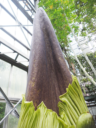 インドネシア・スマトラ島の限られた場所に生える、サトイモ科の絶滅危惧植物。世界最大級といわれる「花」(1つの花のように見えますが、小さな花が集まった花序です。このように、花序全体がまとまって1つの花のように見えるものは「偽花」と呼ばれます)は、高さ3m直径1m以上にもなります。また腐った肉のような強烈な臭いを放ち、世界でもっとも醜い花とも呼ばれます。ギネスブックで認定された世界最大の記録は高さ3.1mで、今回どこまで大きくなるかが注目されます。