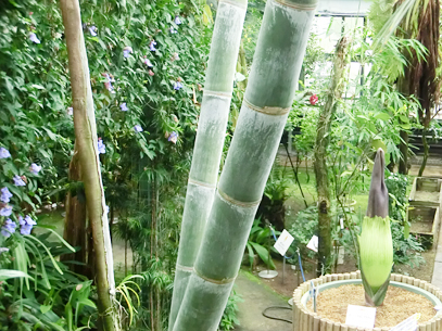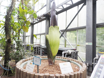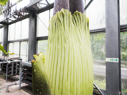 インドネシア・スマトラ島の限られた場所に生える、サトイモ科の絶滅危惧植物。世界最大級といわれる「花」(1つの花のように見えますが、小さな花が集まった花序です。このように、花序全体がまとまって1つの花のように見えるものは「偽花」と呼ばれます)は、高さ3m直径1m以上にもなります。また腐った肉のような強烈な臭いを放ち、世界でもっとも醜い花とも呼ばれます。ギネスブックで認定された世界最大の記録は高さ3.1mで、今回どこまで大きくなるかが注目されます。