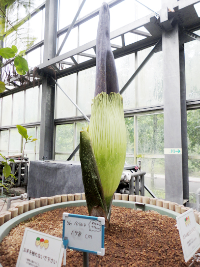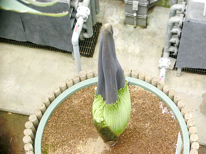 インドネシア・スマトラ島の限られた場所に生える、サトイモ科の絶滅危惧植物。世界最大級といわれる「花」(1つの花のように見えますが、小さな花が集まった花序です。このように、花序全体がまとまって1つの花のように見えるものは「偽花」と呼ばれます)は、高さ3m直径1m以上にもなります。また腐った肉のような強烈な臭いを放ち、世界でもっとも醜い花とも呼ばれます。ギネスブックで認定された世界最大の記録は高さ3.1mで、今回どこまで大きくなるかが注目されます。