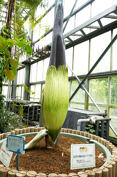 インドネシア・スマトラ島の限られた場所に生える、サトイモ科の絶滅危惧植物。世界最大級といわれる「花」(1つの花のように見えますが、小さな花が集まった花序です。このように、花序全体がまとまって1つの花のように見えるものは「偽花」と呼ばれます)は、高さ3m直径1m以上にもなります。また腐った肉のような強烈な臭いを放ち、世界でもっとも醜い花とも呼ばれます。ギネスブックで認定された世界最大の記録は高さ3.1mで、今回どこまで大きくなるかが注目されます。