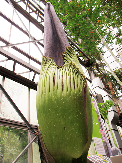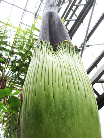 インドネシア・スマトラ島の限られた場所に生える、サトイモ科の絶滅危惧植物。世界最大級といわれる「花」(1つの花のように見えますが、小さな花が集まった花序です。このように、花序全体がまとまって1つの花のように見えるものは「偽花」と呼ばれます)は、高さ3m直径1m以上にもなります。また腐った肉のような強烈な臭いを放ち、世界でもっとも醜い花とも呼ばれます。ギネスブックで認定された世界最大の記録は高さ3.1mで、今回どこまで大きくなるかが注目されます。