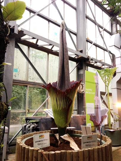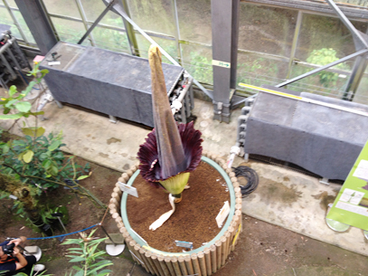 インドネシア・スマトラ島の限られた場所に生える、サトイモ科の絶滅危惧植物。世界最大級といわれる「花」(1つの花のように見えますが、小さな花が集まった花序です。このように、花序全体がまとまって1つの花のように見えるものは「偽花」と呼ばれます)は、高さ3m直径1m以上にもなります。また腐った肉のような強烈な臭いを放ち、世界でもっとも醜い花とも呼ばれます。ギネスブックで認定された世界最大の記録は高さ3.1mで、今回どこまで大きくなるかが注目されます。