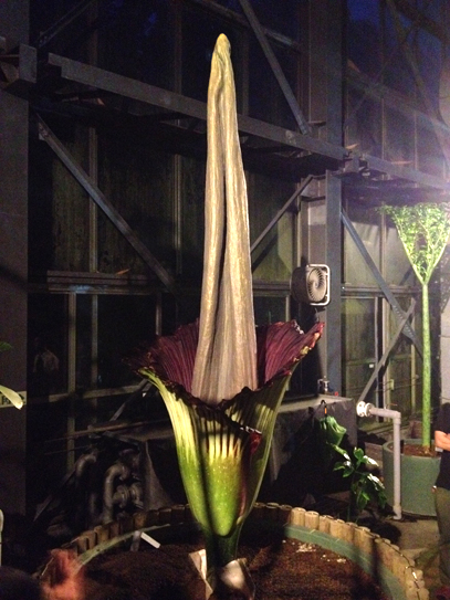 23:00撮影。仏縁苞の開きが水平に近づいてきました。この後、ライトを消した1時間後、さらに開いていました。