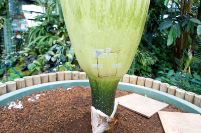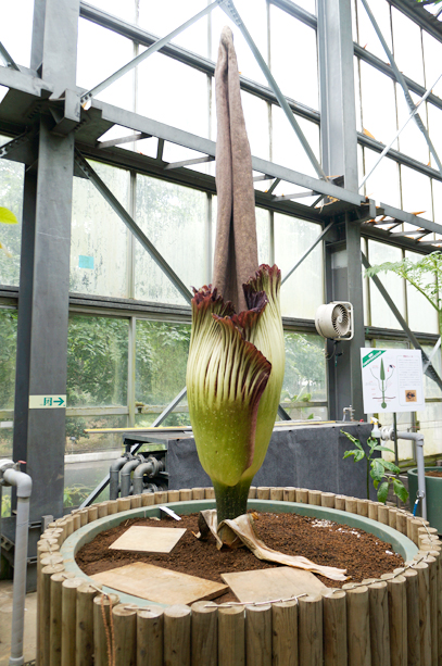 インドネシア・スマトラ島の限られた場所に生える、サトイモ科の絶滅危惧植物。世界最大級といわれる「花」(1つの花のように見えますが、小さな花が集まった花序です。このように、花序全体がまとまって1つの花のように見えるものは「偽花」と呼ばれます)は、高さ3m直径1m以上にもなります。また腐った肉のような強烈な臭いを放ち、世界でもっとも醜い花とも呼ばれます。ギネスブックで認定された世界最大の記録は高さ3.1mで、今回どこまで大きくなるかが注目されます。