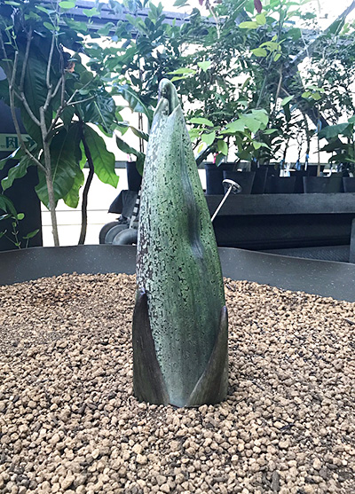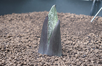 インドネシア・スマトラ島の限られた場所に生える、サトイモ科の絶滅危惧植物。世界最大級といわれる「花」(1つの花のように見えますが、小さな花が集まった花序です。このように、花序全体がまとまって1つの花のように見えるものは「偽花」と呼ばれます)は、高さ3m直径1m以上にもなります。また腐った肉のような強烈な臭いを放ち、世界でもっとも醜い花とも呼ばれます。ギネスブックで認定された世界最大の記録は高さ3.1mで、今回どこまで大きくなるかが注目されます。