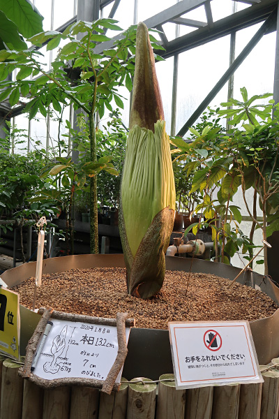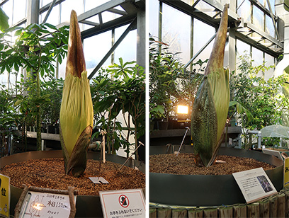 インドネシア・スマトラ島の限られた場所に生える、サトイモ科の絶滅危惧植物。世界最大級といわれる「花」(1つの花のように見えますが、小さな花が集まった花序です。このように、花序全体がまとまって1つの花のように見えるものは「偽花」と呼ばれます)は、高さ3m直径1m以上にもなります。また腐った肉のような強烈な臭いを放ち、世界でもっとも醜い花とも呼ばれます。ギネスブックで認定された世界最大の記録は高さ3.1mで、今回どこまで大きくなるかが注目されます。