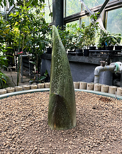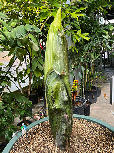 インドネシア・スマトラ島の限られた場所に生える、サトイモ科の絶滅危惧植物。世界最大級といわれる「花」(1つの花のように見えますが、小さな花が集まった花序です。このように、花序全体がまとまって1つの花のように見えるものは「偽花」と呼ばれます)は、高さ3m直径1m以上にもなります。また腐った肉のような強烈な臭いを放ち、世界でもっとも醜い花とも呼ばれます。ギネスブックで認定された世界最大の記録は高さ3.1mで、今回どこまで大きくなるかが注目されます。