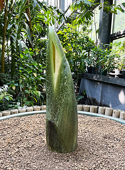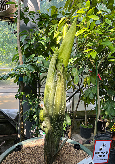 インドネシア・スマトラ島の限られた場所に生える、サトイモ科の絶滅危惧植物。世界最大級といわれる「花」(1つの花のように見えますが、小さな花が集まった花序です。このように、花序全体がまとまって1つの花のように見えるものは「偽花」と呼ばれます)は、高さ3m直径1m以上にもなります。また腐った肉のような強烈な臭いを放ち、世界でもっとも醜い花とも呼ばれます。ギネスブックで認定された世界最大の記録は高さ3.1mで、今回どこまで大きくなるかが注目されます。