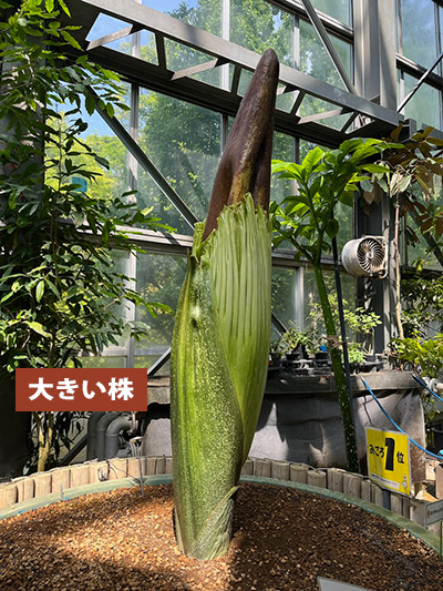 インドネシア・スマトラ島の限られた場所に生える、サトイモ科の絶滅危惧植物。世界最大級といわれる「花」(1つの花のように見えますが、小さな花が集まった花序です。このように、花序全体がまとまって1つの花のように見えるものは「偽花」と呼ばれます)は、高さ3m直径1m以上にもなります。また腐った肉のような強烈な臭いを放ち、世界でもっとも醜い花とも呼ばれます。ギネスブックで認定された世界最大の記録は高さ3.1mで、今回どこまで大きくなるかが注目されます。