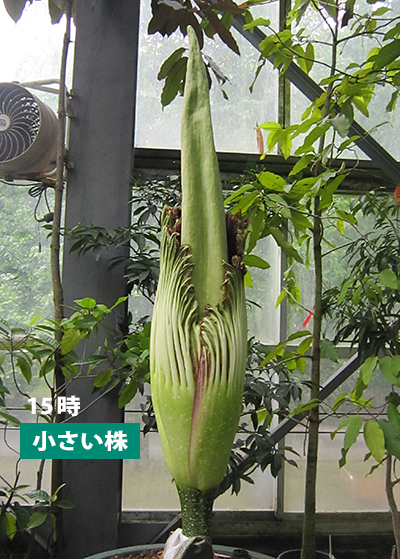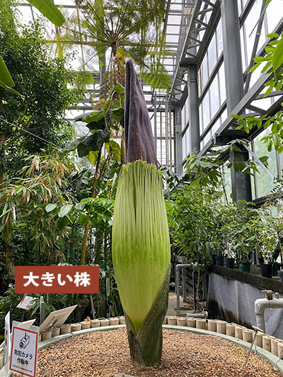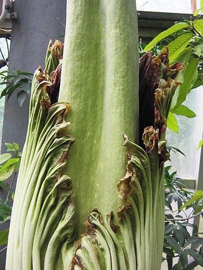 インドネシア・スマトラ島の限られた場所に生える、サトイモ科の絶滅危惧植物。世界最大級といわれる「花」(1つの花のように見えますが、小さな花が集まった花序です。このように、花序全体がまとまって1つの花のように見えるものは「偽花」と呼ばれます)は、高さ3m直径1m以上にもなります。また腐った肉のような強烈な臭いを放ち、世界でもっとも醜い花とも呼ばれます。ギネスブックで認定された世界最大の記録は高さ3.1mで、今回どこまで大きくなるかが注目されます。