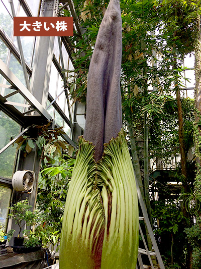 インドネシア・スマトラ島の限られた場所に生える、サトイモ科の絶滅危惧植物。世界最大級といわれる「花」(1つの花のように見えますが、小さな花が集まった花序です。このように、花序全体がまとまって1つの花のように見えるものは「偽花」と呼ばれます)は、高さ3m直径1m以上にもなります。また腐った肉のような強烈な臭いを放ち、世界でもっとも醜い花とも呼ばれます。ギネスブックで認定された世界最大の記録は高さ3.1mで、今回どこまで大きくなるかが注目されます。