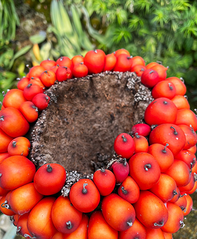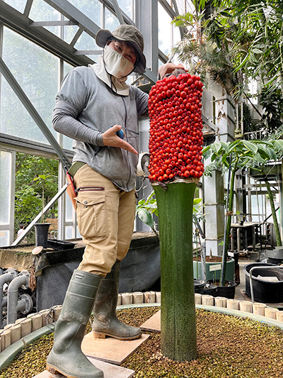 インドネシア・スマトラ島の限られた場所に生える、サトイモ科の絶滅危惧植物。世界最大級といわれる「花」(1つの花のように見えますが、小さな花が集まった花序です。このように、花序全体がまとまって1つの花のように見えるものは「偽花」と呼ばれます)は、高さ3m直径1m以上にもなります。また腐った肉のような強烈な臭いを放ち、世界でもっとも醜い花とも呼ばれます。ギネスブックで認定された世界最大の記録は高さ3.1mで、今回どこまで大きくなるかが注目されます。