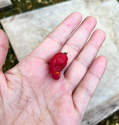 しわしわになった小さな果実が1つあったので、とって中をみてみると、種子はなし。 やはり小さい果実にはきちんと種子ができていないようです。