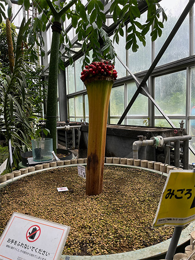インドネシア・スマトラ島の限られた場所に生える、サトイモ科の絶滅危惧植物。世界最大級といわれる「花」(1つの花のように見えますが、小さな花が集まった花序です。このように、花序全体がまとまって1つの花のように見えるものは「偽花」と呼ばれます)は、高さ3m直径1m以上にもなります。また腐った肉のような強烈な臭いを放ち、世界でもっとも醜い花とも呼ばれます。ギネスブックで認定された世界最大の記録は高さ3.1mで、今回どこまで大きくなるかが注目されます。